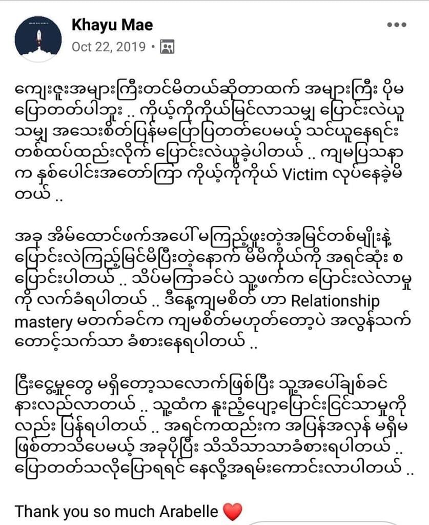 Relationship နဲ့ပတ်သက်တဲ့ နာကျင်စရာတွေကနေ နိုးထလာပြီး လက်ရှိအချိန်မှာ ကိုယ့်အတွက် စစ်မှန်ပြီး resonate ဖြစ်တဲ့ ဆက်ဆံရေးကို လိုချင်တောင့်တနေတဲ့သူ